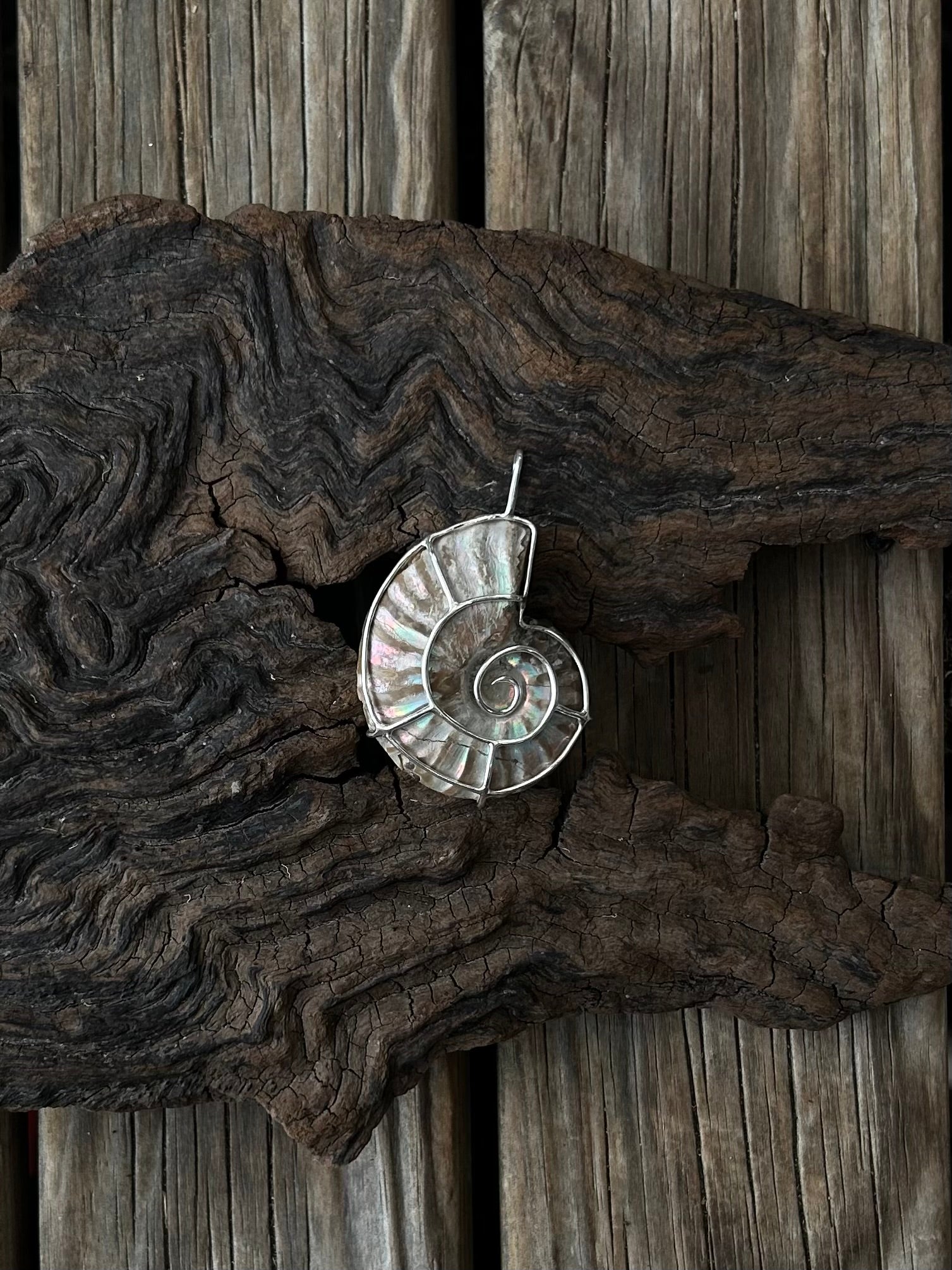 This swirly ammonite pendant is a very special piece. Featuring an insanely beautiful ammonite, with a back that is arguably just as gorgeous as the front. This pendant was specially made for this exact ammonite, with a swirly silver home that would allow the ammonite to speak for itself. This piece allows you to wear a piece of history on your neck.