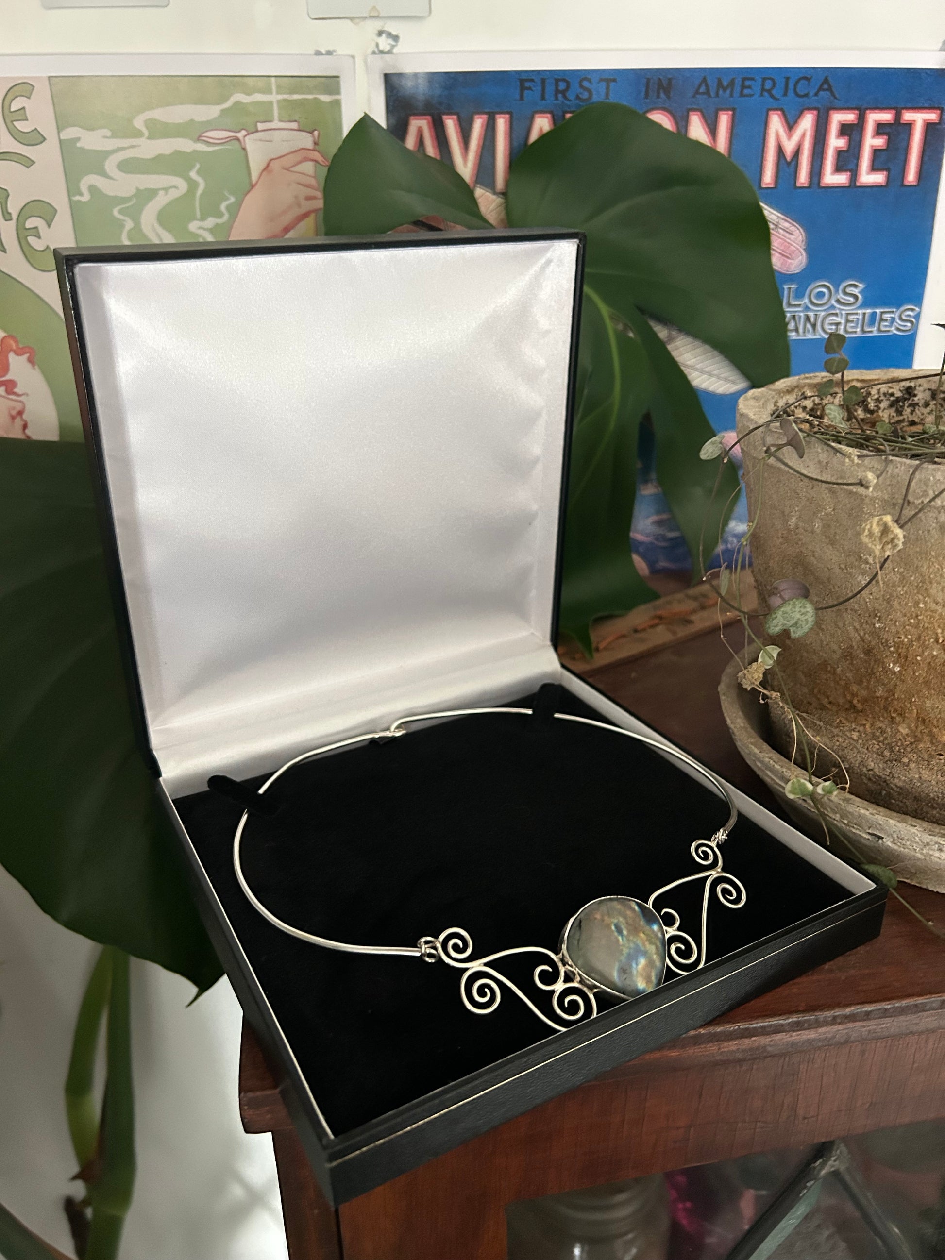 The Paisley necklace is the ultimate ethereal statement piece. Handcrafted out of sustainable materials, sterling silver and fine silver, and featuring a beautiful labradorite. The Paisley necklace is a timeless piece, made to be passed down for generations to come.
